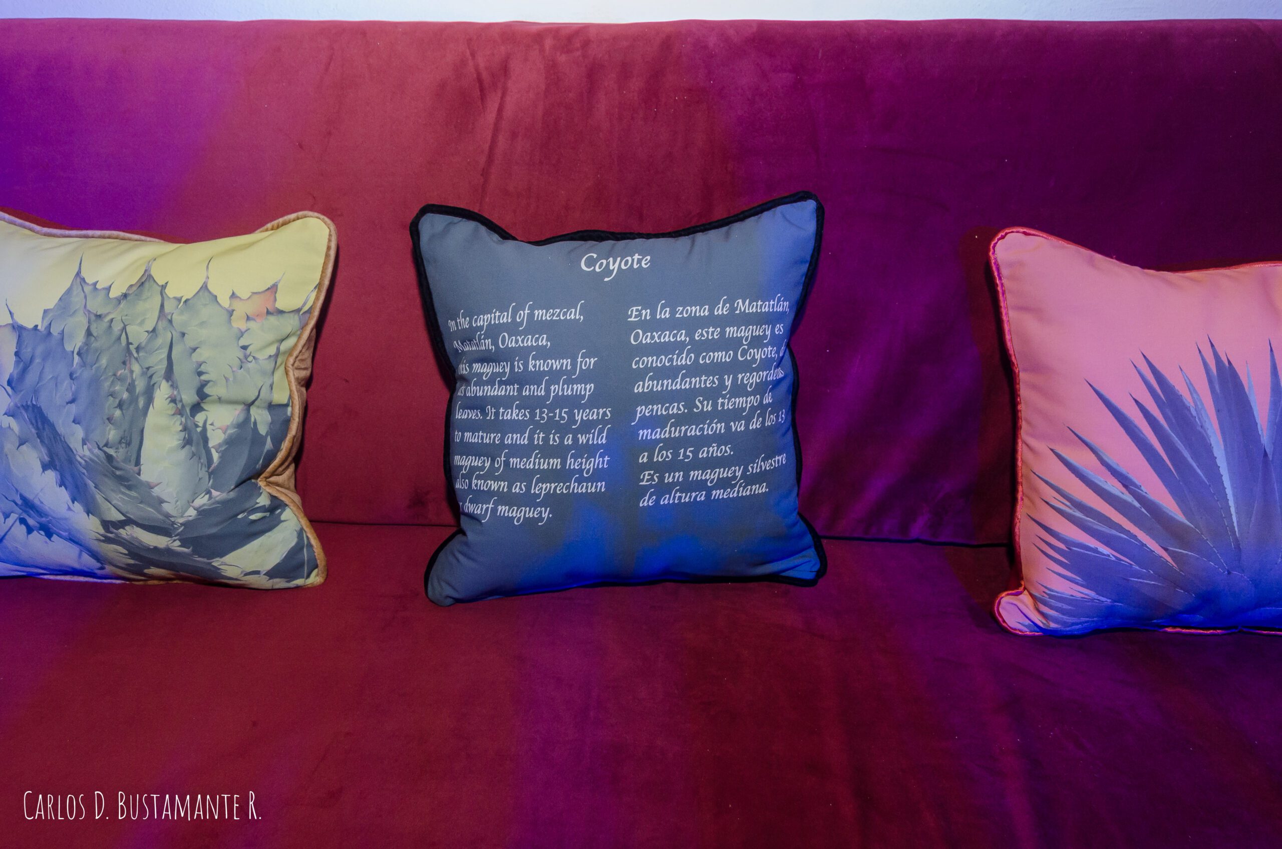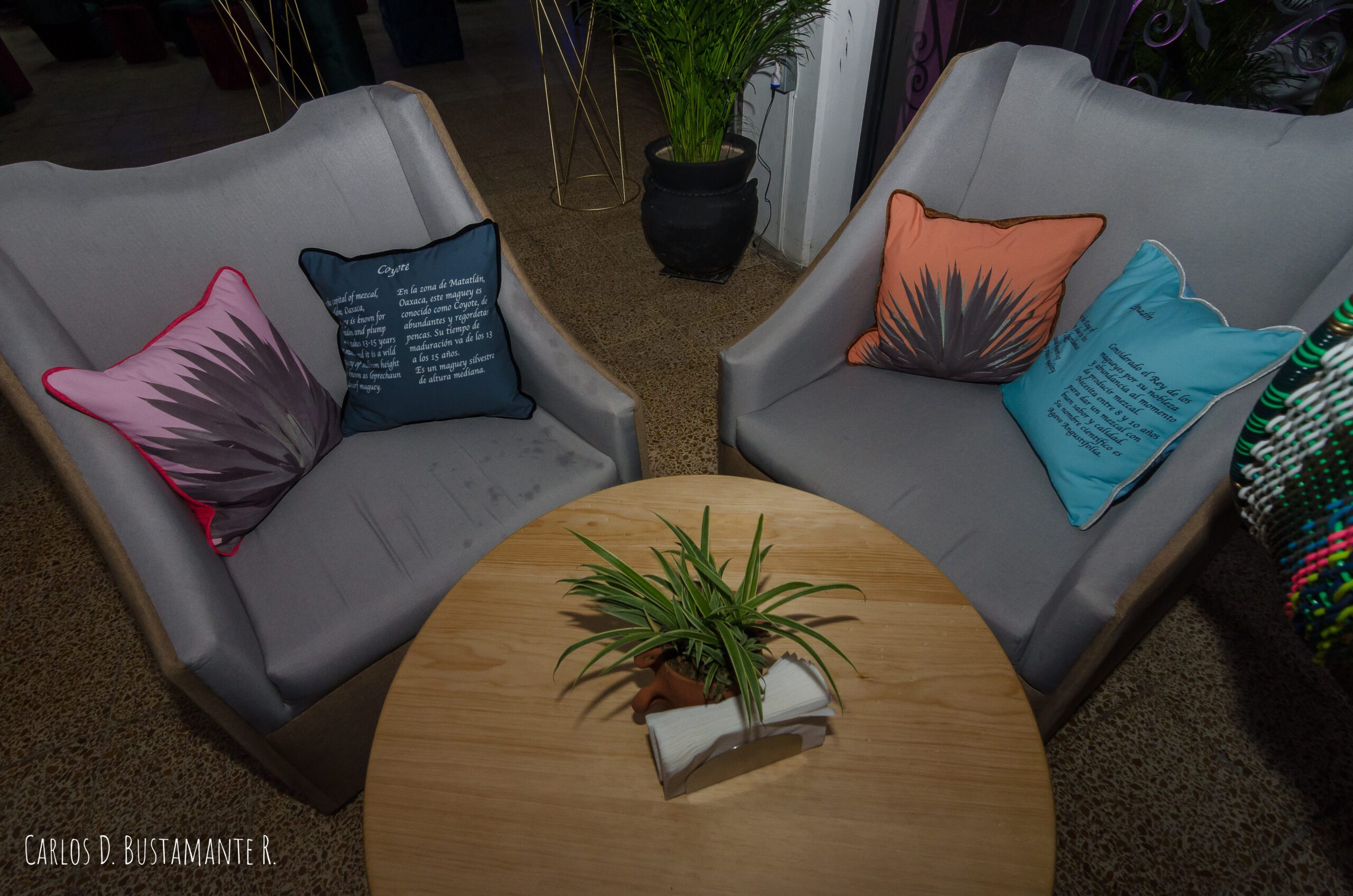 En la atmósfera del lugar, el maguey es el protagonista. El interior contiene obras murales y de caballete del artista Manuel Escobar, así como todo un concepto que alude a esta planta de la cual se extrae la materia prima para elaborar el mezcal. Por ejemplo, las almohadas de algunos asientos explican brevemente dichas especies de agave.