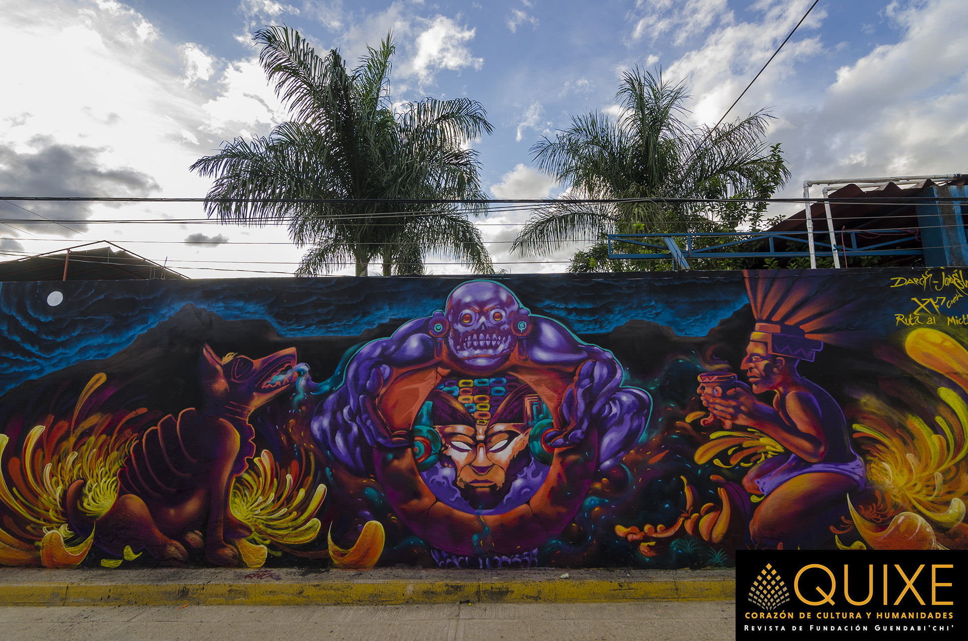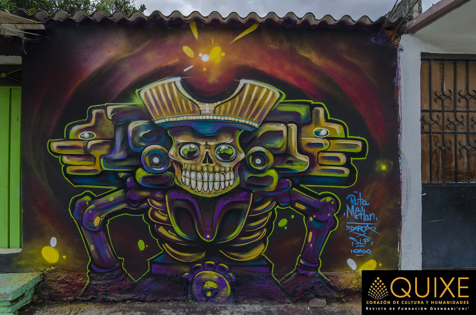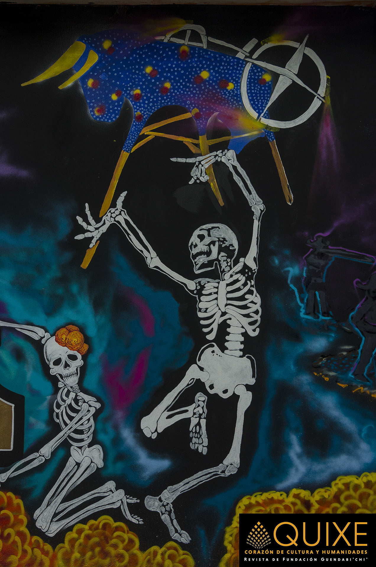La Ruta al Mictlán en Xoxocotlán. En la celebración de las «Muerteadas», los lugareños crean murales que ambientan el espacio donde se bailará, cantará y festejará el Día de Muertos. Tuvimos la fortuna de encontrarnos a Johnnie Daners y Txtz Art en plena ejecución plástica.