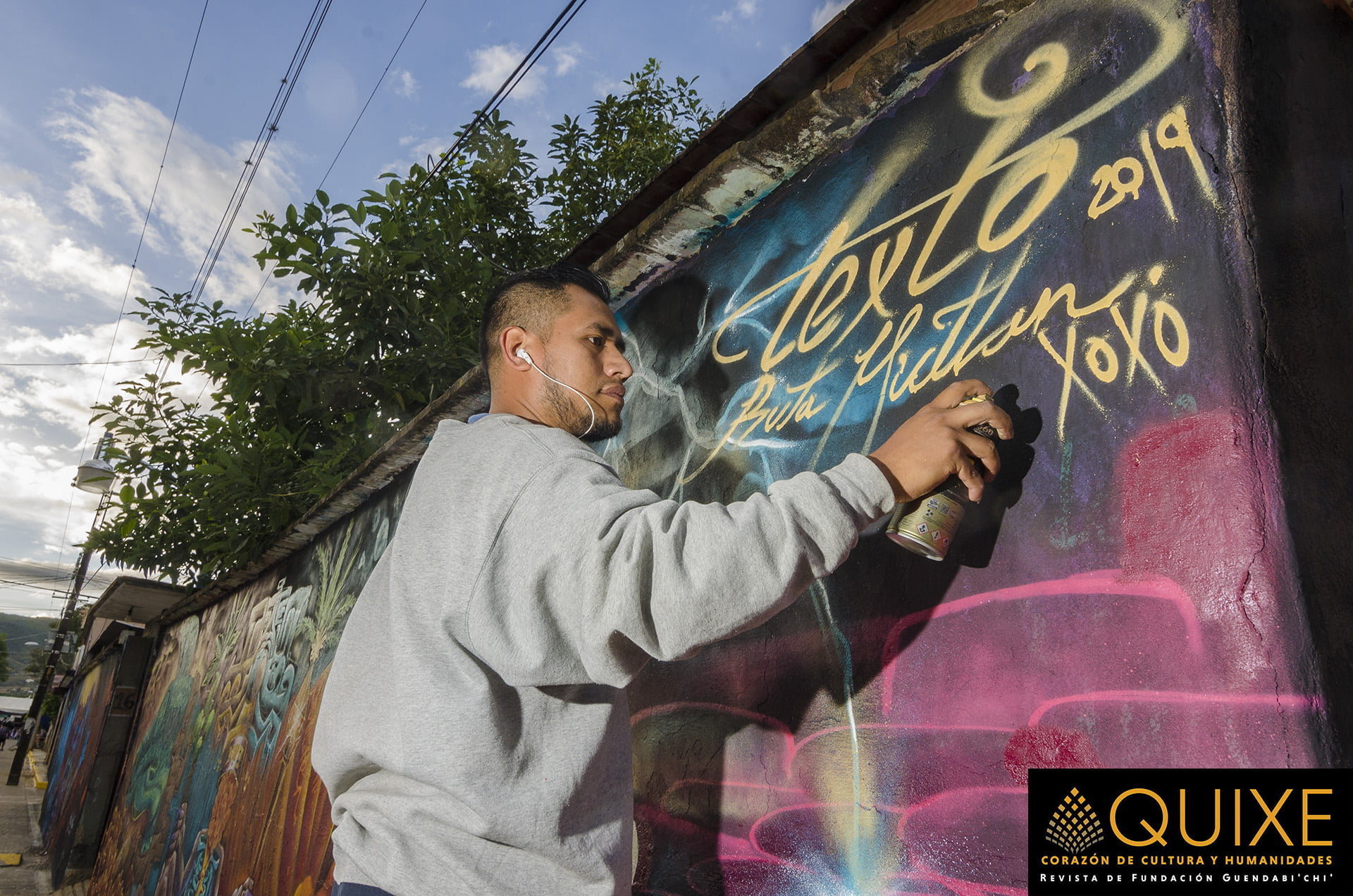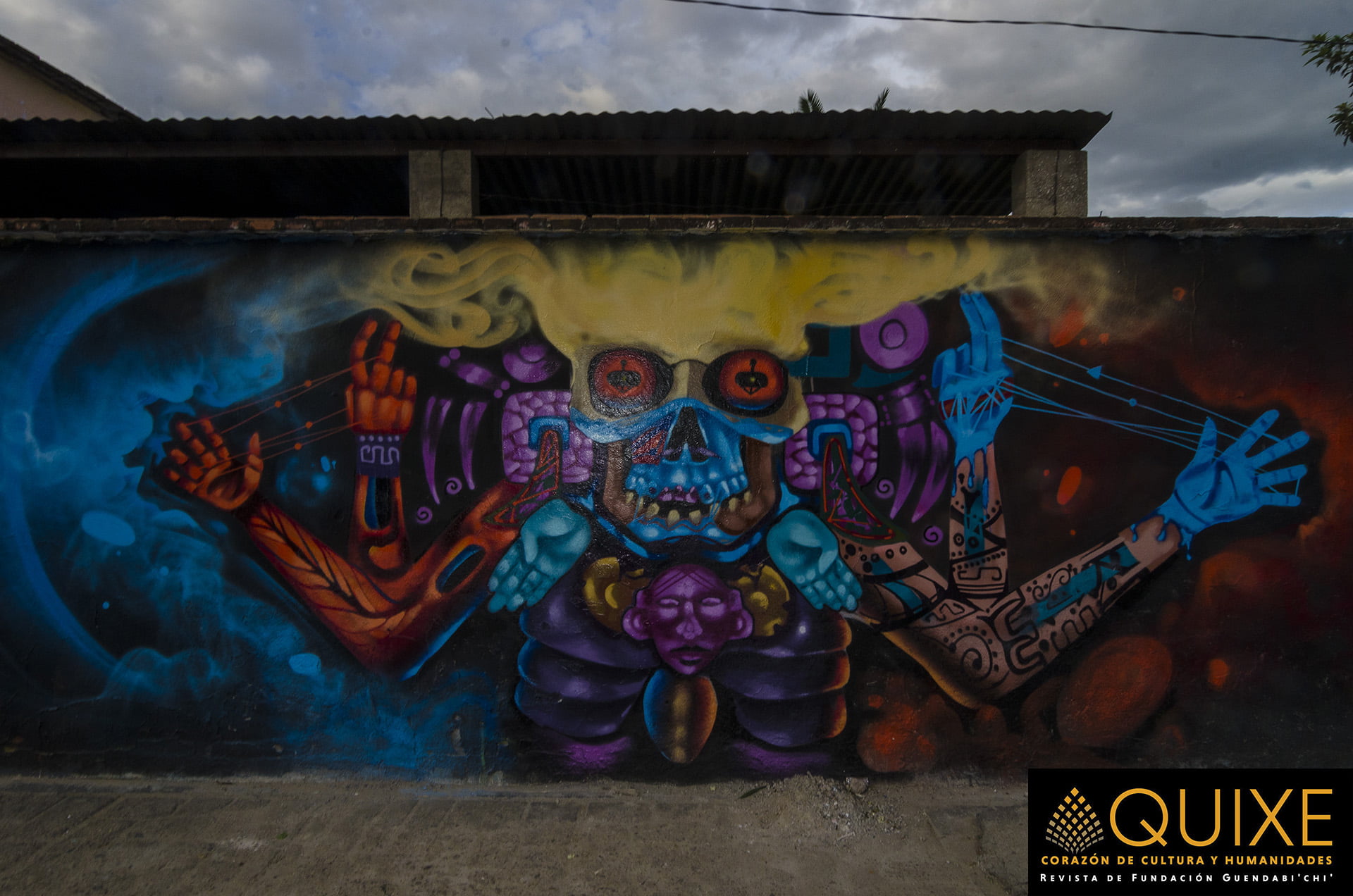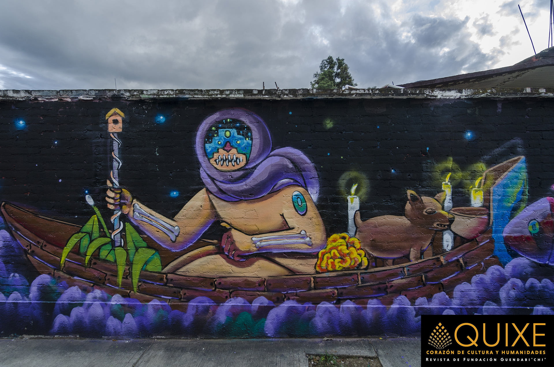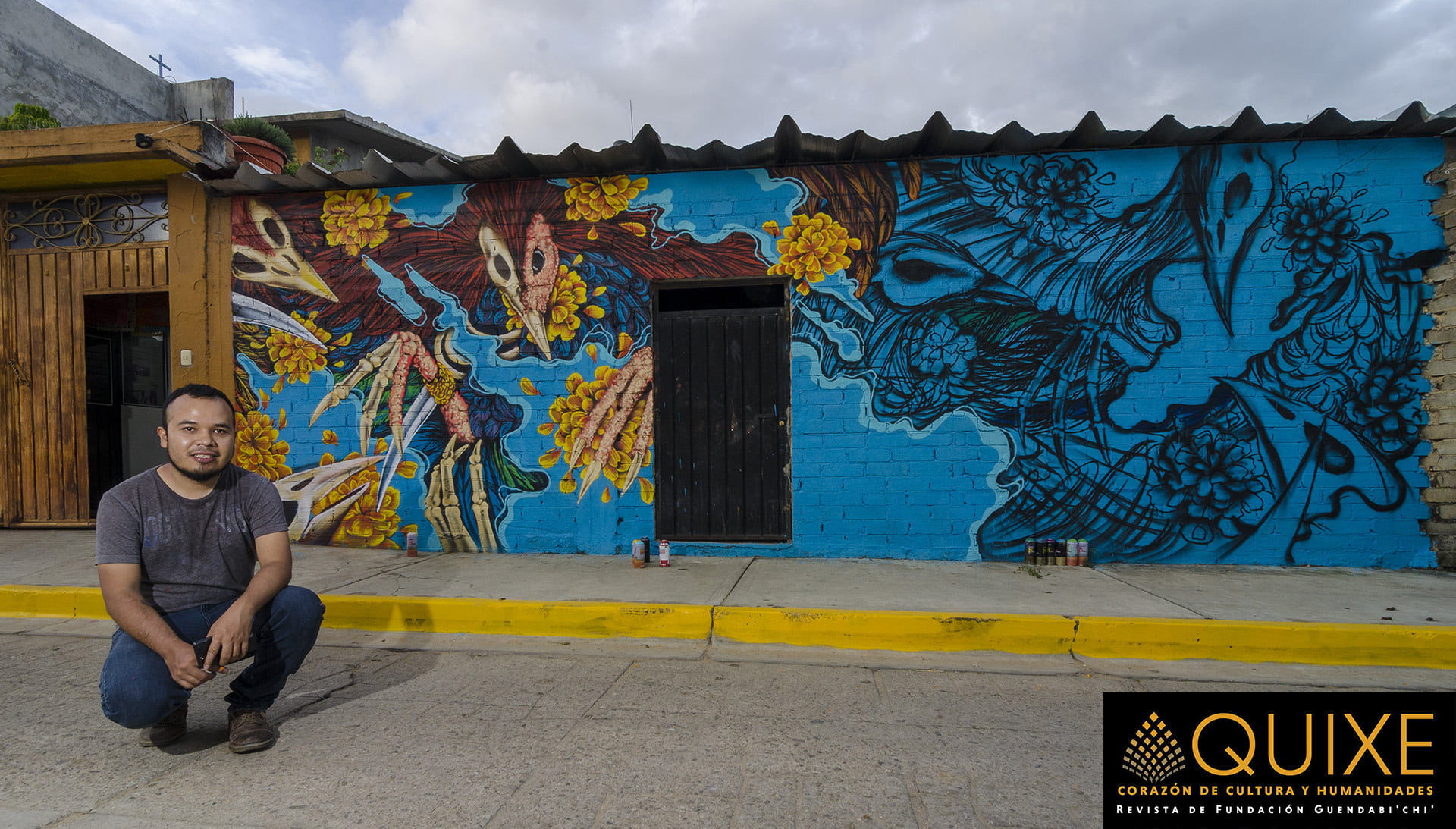 La Ruta al Mictlán en Xoxocotlán. En la celebración de las «Muerteadas», los lugareños crean murales que ambientan el espacio donde se bailará, cantará y festejará el Día de Muertos. Tuvimos la fortuna de encontrarnos a Johnnie Daners y Txtz Art en plena ejecución plástica.