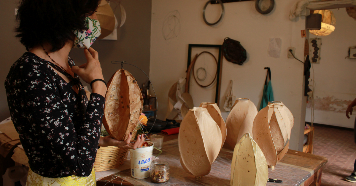 Y es que el proceso no es fácil. Uno, como espectador, puede notar que la belleza de las lámparas reside en su sencillez. Sin embargo, si nos acercamos, veremos que esta sencillez encierra una complejidad incomparable. El papel que reviste el cuerpo de las lámparas está formado por hilos, plantas, flores, brillos… Y todo nos parece familiar y nos hace sentir en casa porque está inspirado en la naturaleza.
